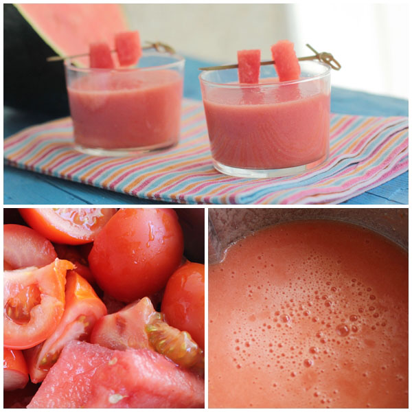 Ponemos en el vaso de la batidora el diente de ajo, pelado y sin el germen central, el tomate, la sandía, el vinagre, el aceite y la sal. Trituramos muy bien, añadimos agua hasta obtener la textura deseada y guardamos en el frigorífico hasta el momento de servir. Podemos servirlo con unos dados de sandía.