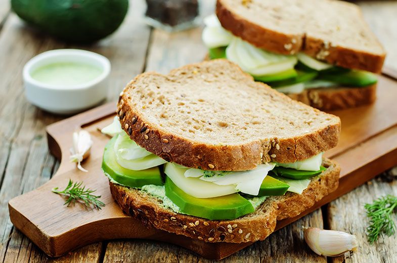 Una buena opción para dar más textura a nuestro sándwich es tostar el pan, que recomendamos sea de espelta o de cereales. Mientras se tuesta, pelamos y cortamos en rodajas los aguacates y el tomate verde.
